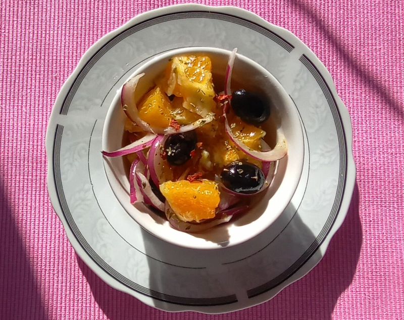 Potreban materijal (za 2 osobe): 2 pomorandže, 1 glavica crvenog luka (srednje veličine), nekoliko maslina, so, 1 kašičica sušenog origana i 2-3 kašike ekstradevičanskog maslinovog ulja (po mogućnosti – grčkog).